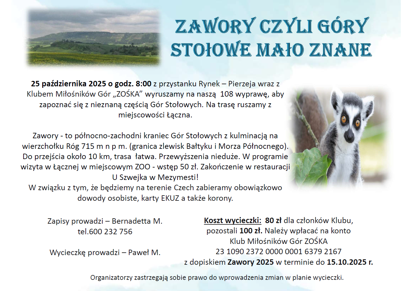 Jesień zadomowiła się w Polsce już na dobre. Lasy i parki mienią się ferią barw w promieniach jesiennego słońca. A jak to wygląda w górach? Aby to sprawdzić Klub Miłośników Gór wyruszył w sobotni poranek na swoją 108 wyprawę w Góry Stołowe a dokładnie w pasmo Zawory.