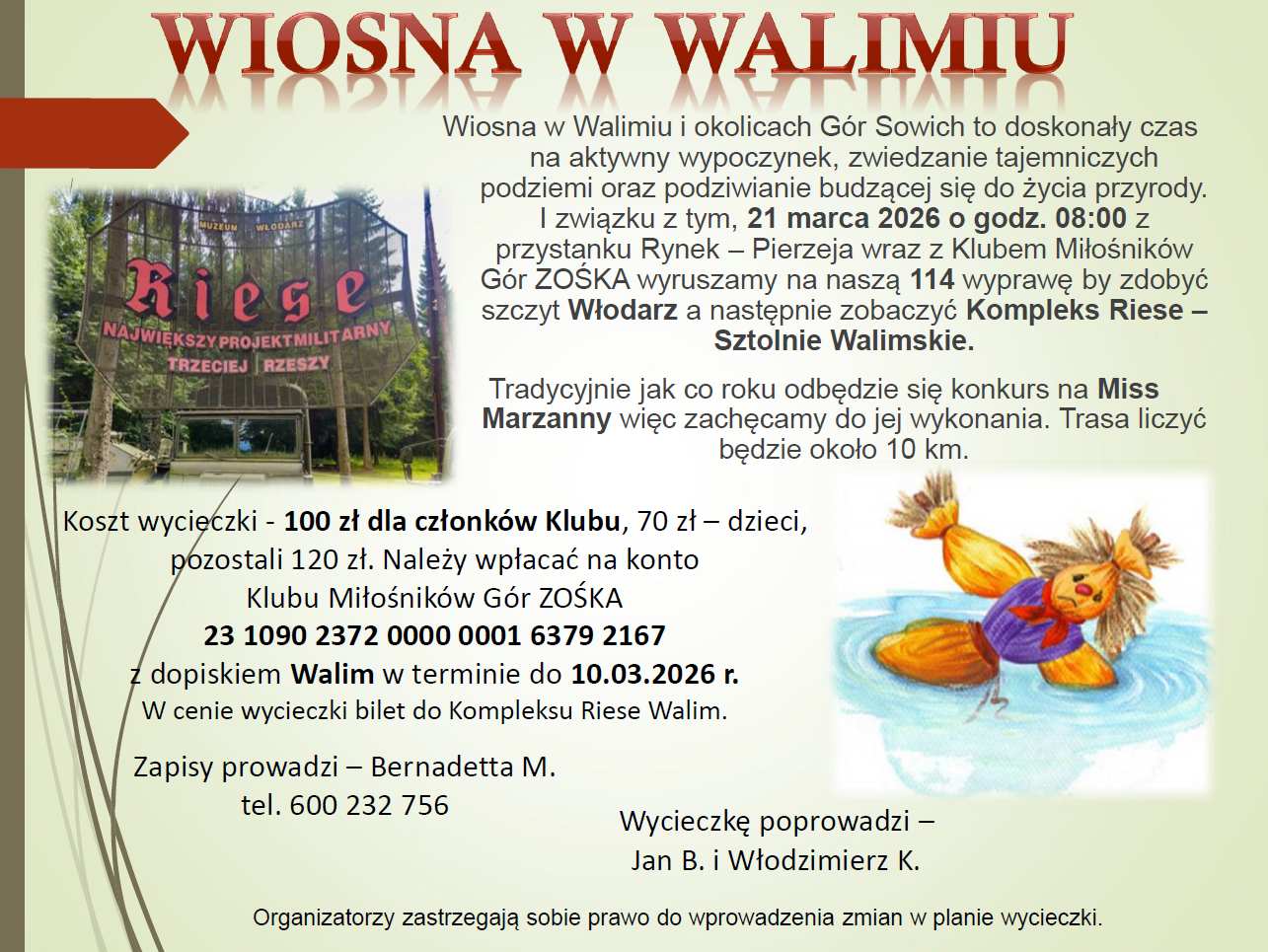 Chociaż jest koniec stycznia a zima w pełni, śniegu mamy jak na lekarstwo, czy to we Wrocławiu, Ząbkowicach Śląskich czy w Świdnicy. Dlatego wraz z Klubem Miłośników Gór wybieramy się na 112 wyprawę w Karkonosze. Czy tam będziemy mieli okazję nacieszyć się śniegiem? Już niedługo się o tym przekonamy. Wszyscy jednak są dobrej myśli, gdyż realizacja naszego planu wycieczkowego w dużej mierze zależy od śniegu a dokładnie od jego obecności, ponieważ jedziemy na .............